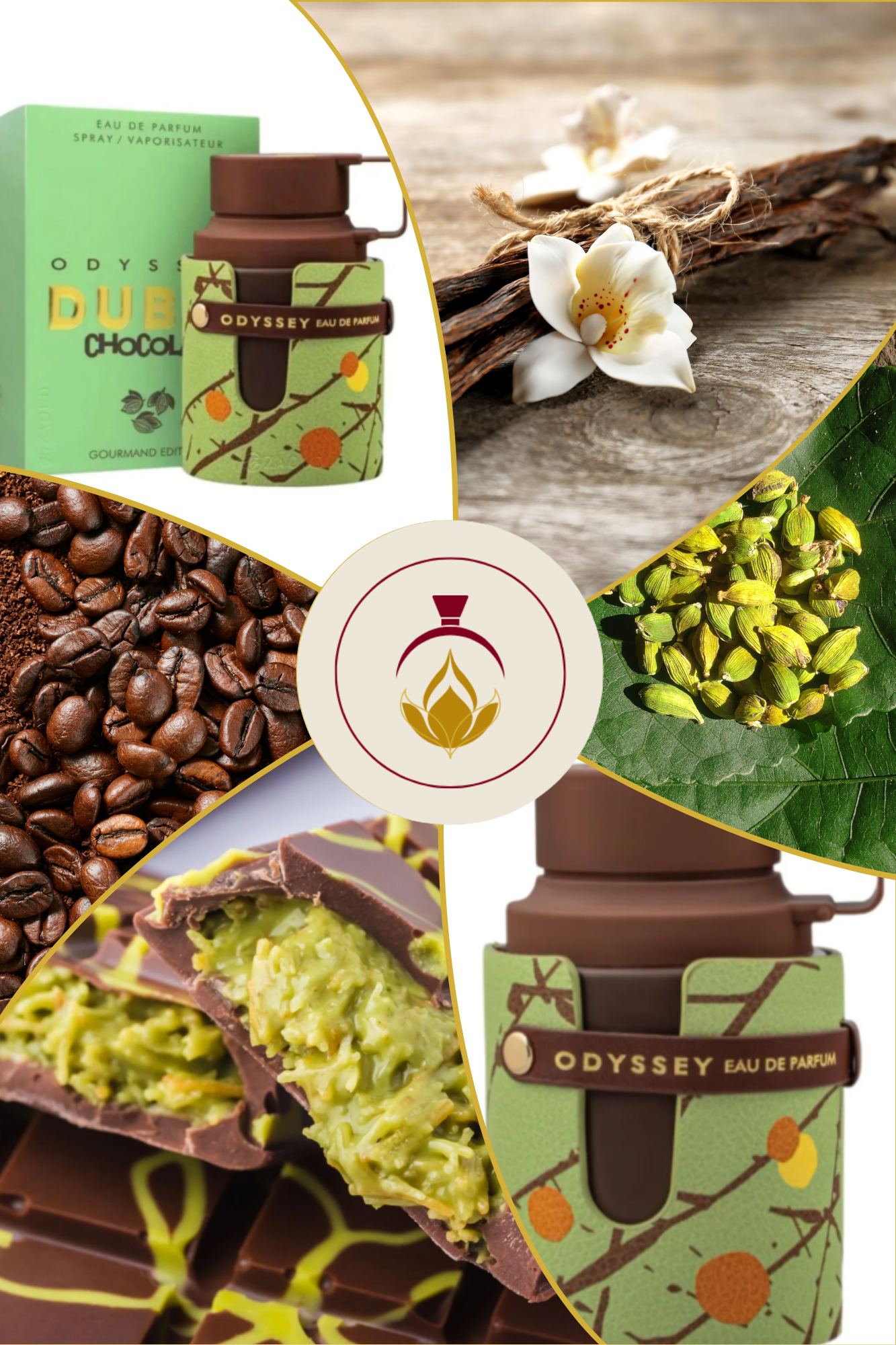 Sus notas de salida combinan café, pistacho, praliné, avellana y knafeh, seguidas por un corazón exquisito de chocolate, vainilla y cardamomo. En el fondo, caramelo dorado, haba tonka y ámbar amaderado dejan una estela cálida, elegante y adictiva.